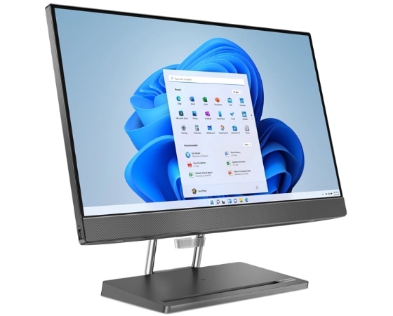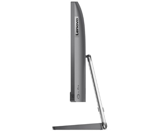 Les trois quarts du tout-en-un Lenovo IdeaCentre 5i Gen 7 tout-en-un se positionnent à la verticale.