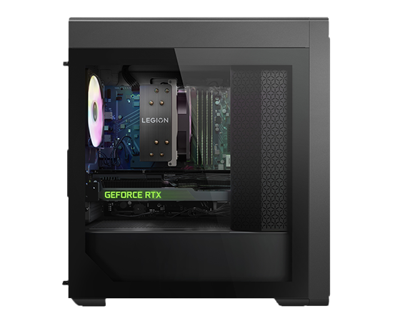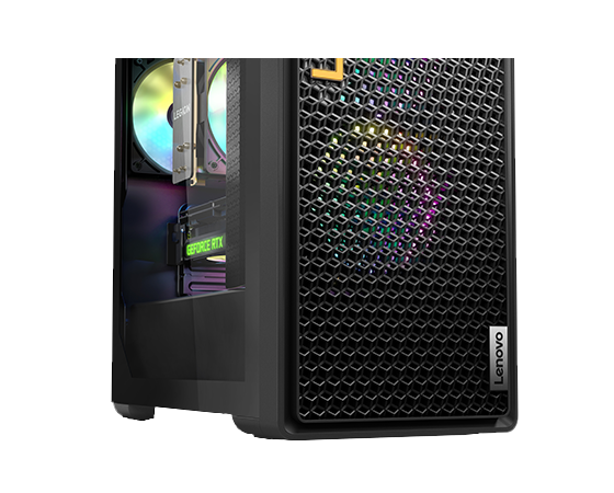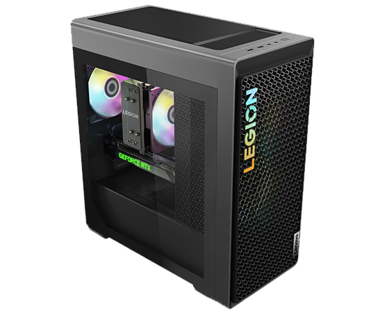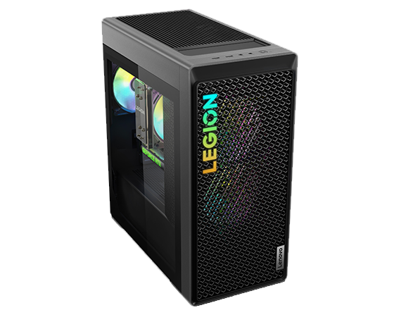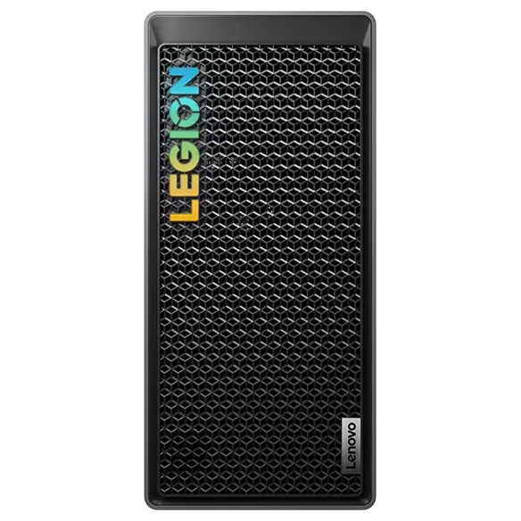 Vue avant de niveau oculaire de l’ordinateur de jeux Legion Tower 5 Gen 8 (AMD), montrant le boîtier avant vented et le logo coloré Legion.