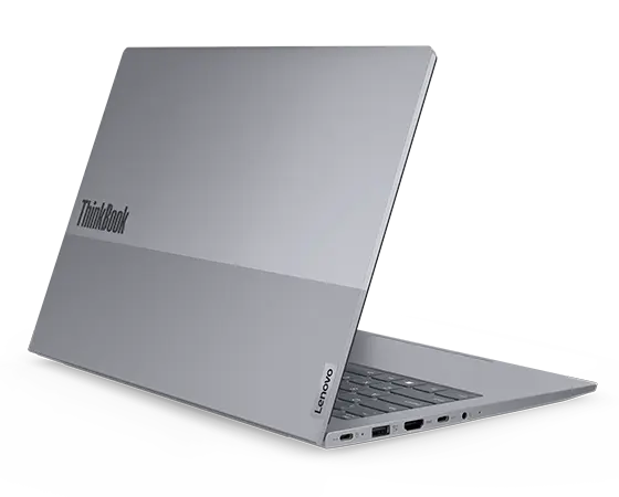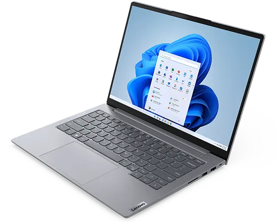 Vue aérienne du portable Lenovo ThinkBook 14 Gen 6 montrant l’écran avec le menu Démarrer de Windows 11, le clavier, les ports et les fentes du côté droit.