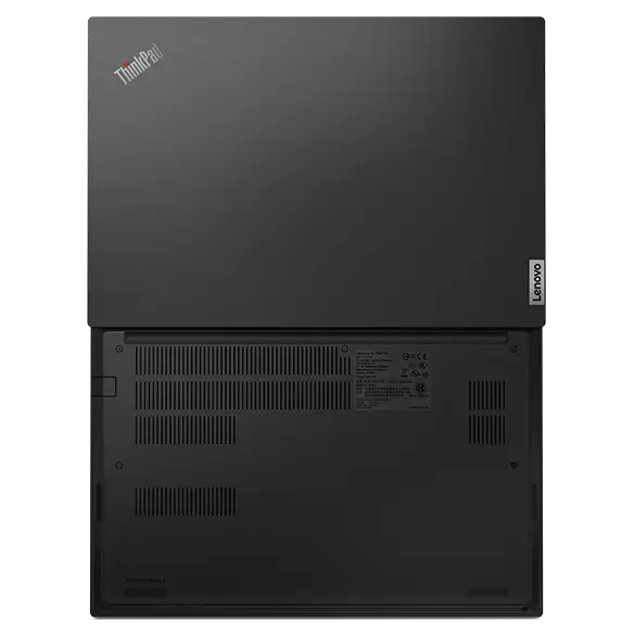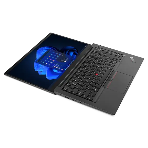 Vue avant du portable d’entreprise ThinkPad E14 Gen 4, ouvert à 90 degrés, montrant le clavier et l’écran avec Windows 11