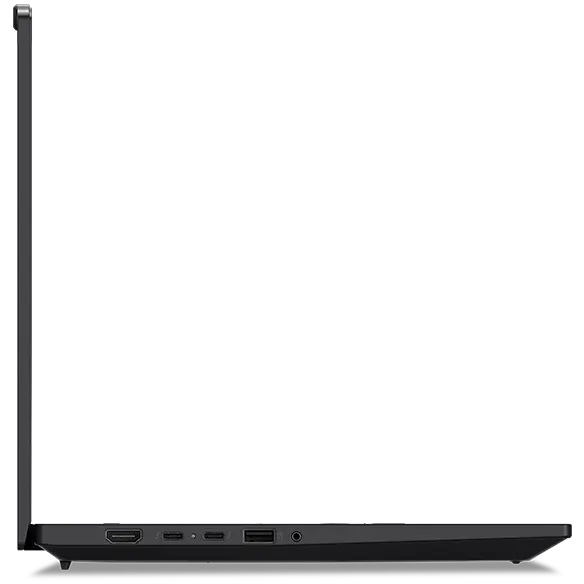 Gros plan du portable Lenovo ThinkPad P14s Gen 5 (14 pouces Intel) noir avec couvercle ouvert à grand angle, mettant en évidence son clavier et son écran avec le menu Windows 11 Pro ouvert sur l’écran.