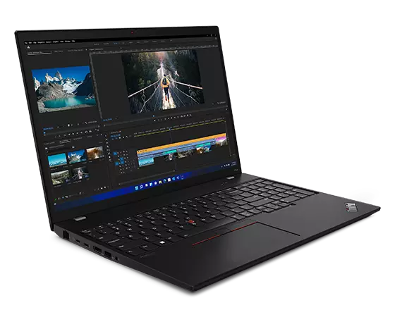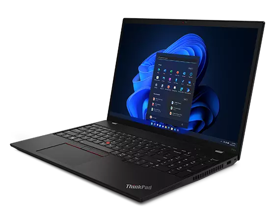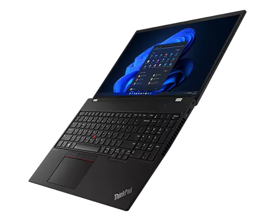 Vue latérale du portable Lenovo ThinkPad P16s Gen 2 (16 » Intel), ouvert à plat, flottant à un angle de 45 degrés, montrant l’écran et le clavier