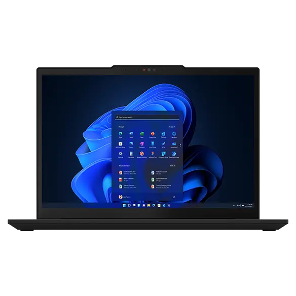 Un portable ThinkPad X13 Gen 4 faisant face à l’avant ouvert à 90° pour montrer le clavier et l’écran