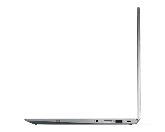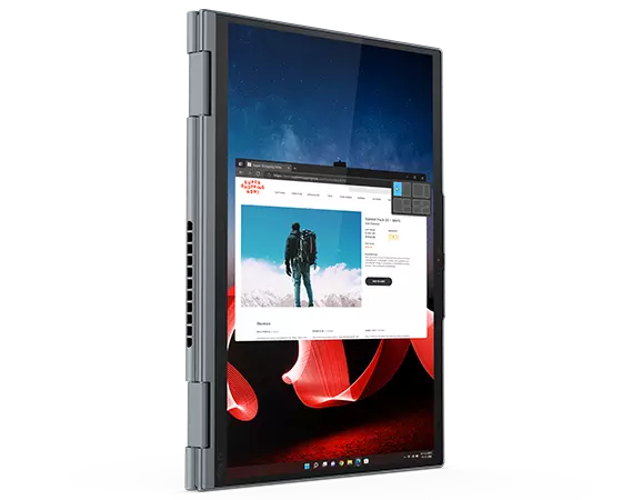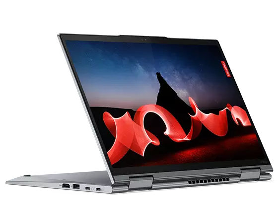 Portable Lenovo ThinkPad X1 Yoga Gen 8 2 en 1 en mode tente avec Windows 11 Pro sur l’écran et incliné pour montrer les ports du côté gauche.