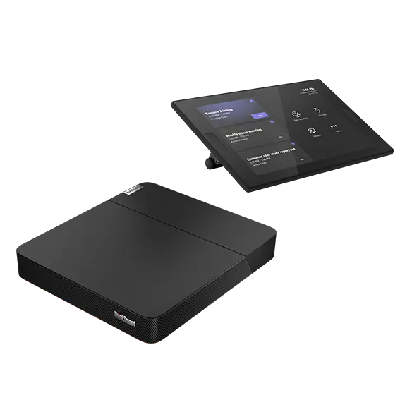 Lenovo ThinkSmart Core + Controller Kit t pour Microsoft Teams avec périphérique informatique Core au premier plan et écran contrôleur 10.1 pouces à l’arrière.
