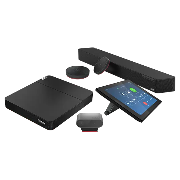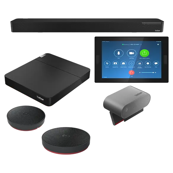 Kit lenovo ThinkSmart Core Full Room pour zoom dans le sens des aiguilles d’une montre: barre, écran du contrôleur, came, pods micro en option et périphérique informatique core.